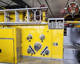 drivers’ side mounted brushed stainless steel pump panels, extended front bumper with recessed hose tray, set up